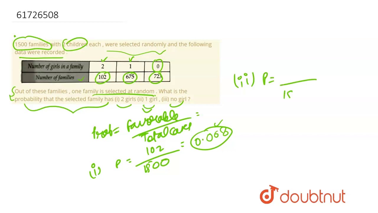 1500 families with 2 children each , were selected randomly and the following data were recorded . Out of these families , one family is selected at random . What is the probability that the selected family has (i) 2 girls (ii) 1 girl , (iii) no girl ?